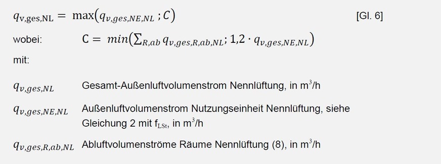 Demnach ist nur das Minimum aus der Summe der Luftvolumenströme der Ablufträume und des 1,2-Fachen des Luftvolumenstroms für die Nutzungseinheit anzurechnen.