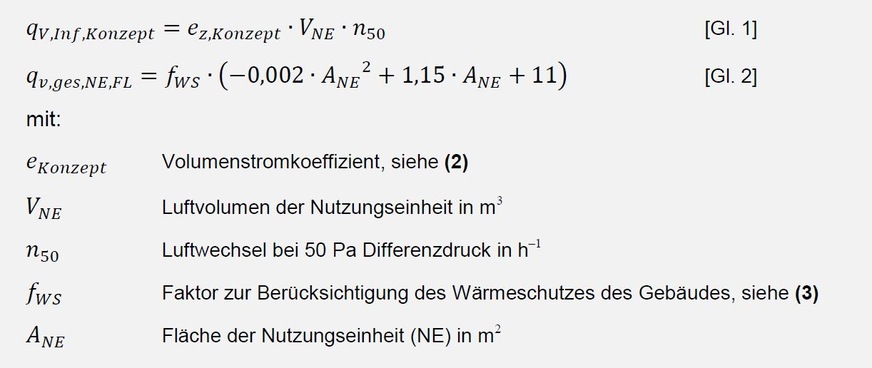 Um die Notwendigkeit lüftungstechnischer Maßnahmen zu überprüfen, wird die für übliche Nutzungen erforderliche Lüftung zum Feuchteschutz qv,ges,NE,FL [Gl. 2] mit dem durch Infiltration realisierbaren Luftvolumenstrom qV,Inf,Konzept [Gl. 1] verglichen. Ist qV,Inf,Konzept < qv,ges,NE,FL, sind lüftungstechnische Maßnahmen notwendig. Die erforderlichen Luftvolumenströme werden wie folgt berechnet: