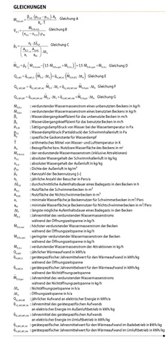 Zur Bestimmung des Energiebedarfs sind im Anschluss daran die drei maßgeblichen verdunstenden Wassermassenströme zu berechnen: die Ruheverdunstung, die Verdunstung beim Badebetrieb inklusive aller Attraktionen sowie die minimale Verdunstung bei der Öffnung des Schwimmbads (mit Attraktionen, ohne Nutzung). Daraus lässt sich die Kennlinie des verdunstenden Wassermassenstroms bestimmen, aus der zusammen mit der Kennzahl der Beckennutzung das Jahresmittel des verdunstenden Wassermassenstroms im Badebetrieb ermittelt werden kann. Dieses ist die entscheidende Größe zur energetischen Betrachtung und zum Vergleich unterschiedlicher Anlagenkonfigurationen.