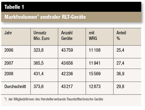 Das Marktvolumen zentraler raumlufttechnischer Geräte, das durch die Mitgliedsfirmen des Herstellerverbands Raumlufttechnische Geräte abgedeckt wird, beläuft sich auf durchschnittlich ca. 370 Mio. Euro (Tabelle 1).
