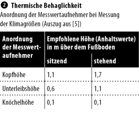 Woher diese Festlegung kommt, ist kaum nachvollziehbar, zumal in DIN EN ISO 7726 [5] – die schon vor dem Erscheinen von [2] eine verbindliche Norm war – in Tabelle 5 Abb. 2 die empfohlenen Höhen für die Anordnung der Messwertaufnehmer zur Messung der Klimagrößen den bisher bekannten Werten entsprechen. Die in [2] und [3] ausgewiesenen Messpunkte sind deshalb mindestens als „irritierend“ zu bewerten.