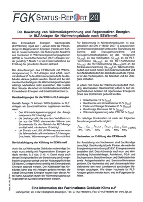 Der FGK-Status-Report 20 „Die Bewertung von Wärmerückgewinnung und Regenerativen Energien in RLT-Anlagen für Nichtwohngebäude nach EEWärmeG“ enthält eine Interpretation des Erneuerbare-Energien-Wärmegesetzes (EEWärmeG) im Hinblick auf Anforderungen an die Lüftungs-, Kälte-, Klima- und Kühltechnik in Nichtwohngebäuden. Der Statusreport gliedert sich in drei Hauptbereiche:
