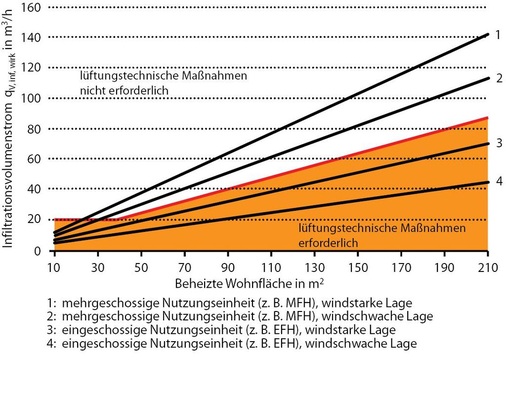 Lüftungstechnische Maßnahmen sind dann erforderlich, wenn der notwendige Luftvolumenstrom zum Feuchteschutz q v,ges,NE,FL nach [2] größer ist als der durch Infiltration q v,inf,wirk ist. Das Beiblatt 2 beinhaltet ausschließlich den Aspekt des Feuchteschutzes und nicht die der erforderlichen Nennlüftung nach [2], die es zu gewährleisten gilt. Der Luftvolumenstrom durch Infiltration q v,inf,wirk kann nach folgender Beziehung berechnet werden.