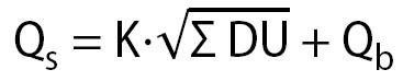 K ist die Abflusskennzahl, die für kleine Hotels 0,5 l/s beträgt. Mit DU wird die Summe der Anschlusswerte bezeichnet. Um sie zu berechnen, werden zuerst sämtliche DU-Werte der im Objekt vorhandenen Entwässerungsgegenstände addiert. Diese Werte können aus der Norm entnommen werden. Daraus ergibt sich im Beispiel ein Gesamtanschlusswert von 187,3 l/s. Bei Bedarf kann noch ein Abflusswert für besondere Belastungen (Q b ) addiert werden, der in diesem Beispiel entfällt. Das Ergebnis beträgt Q s = 6,84 l/s =24,62 m 3 /h.