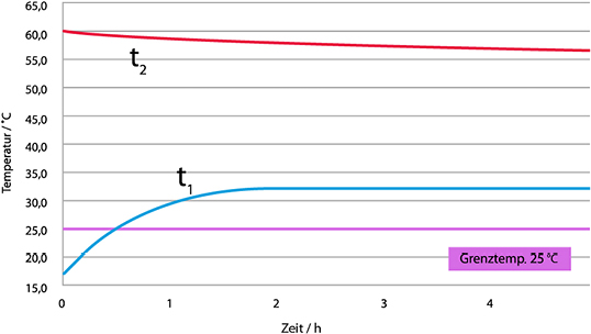 Die Temperaturverläufe während einer 5-stündigen Messreihe sind in Abb. 7 dargestellt. Versuchsstandbedingt sank die Temperatur t 2 in der Doppelwandscheibe des Warmwasseranschlusses von 60,2 auf 56,4 °C, da der Speicher nicht nachgeheizt wurde. Sie befand sich aber während der Versuchsdauer über der normativ geforderten Temperatur für die Zirkulation. Ganz anders stellten sich die Temperaturverhältnisse in der Doppelwandscheibe des Kaltwasseranschlusses dar. Hier stieg die Temperatur nach dem simulierten Duschvorgang von 17,5 °C innerhalb von 2 h auf 32,5 °C und blieb ungefähr konstant.