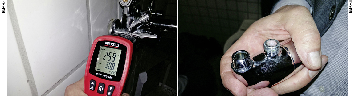 Weiterhin muss auch die maximal erreichbare Temperatur des Systems nach der Probennahme ermittelt werden. Dabei ist vom Probennehmer zu prüfen, ob eine Armatur mit Thermostat oder unter dem Waschtisch ein Eckventil-Thermostat installiert ist Abb. 6 Abb. 9. Dann kann die maximale Systemtemperatur nur vor diesen Bauteilen ermittelt werden, was in der Praxis häufig nicht so durchgeführt wird und dann zu Fehlinterpretationen im Hinblick auf die Temperatureinhaltung in der Warmwasserzirkulation und mögliche Legionellenrisiken führt.