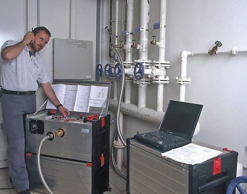 Durch Reinigen der Leitungen mit dem Impuls-Spül-Verfahren (ursprünglich entwickelt zum Spülen kommunaler Trinkwasser-Netze, nun modifiziert für Gebäude, Bild 4) können alle weichen, mobilisierbaren Ablagerungen mitsamt ihrem Bewuchs ausgetragen werden. Das Verfahren basiert auf einer kontrollierten, impulsartigen Zugabe komprimierter, technisch reiner Luft (4-fach-Filter) innerhalb eines definierten, druckreduzierten Spülabschnitts. Es werden gezielt genau dosierte „Luftblöcke“ gesetzt, die der Größe des Rohrleitungsinnendurchmessers entsprechen und im Wechsel mit dem Wasser durch die Leitung wandern. Die Länge der Luftblöcke wie auch der zeitliche Abstand zwischen ihnen ist individuell einstellbar und variiert von Spülabschnitt zu Spülabschnitt.