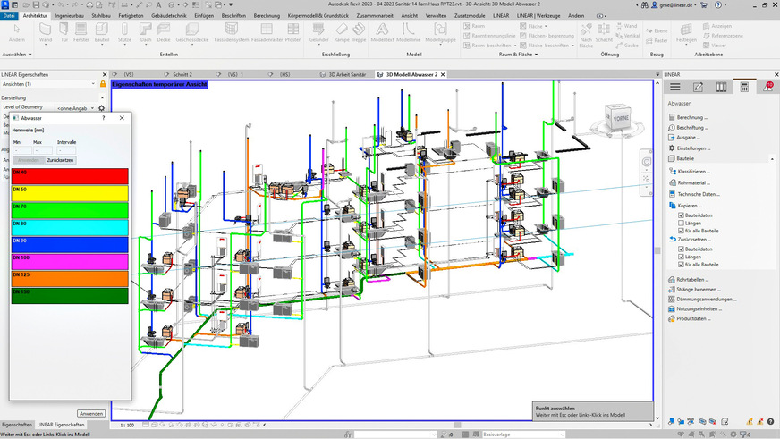 Algorithmen überwachen im Hintergrund die Plausibilität der Netzstruktur und die Normkonformität der Auslegung und Berechnung. Werden neue Sanitärgegenstände eingefügt, entfernt oder verändert, passt sich die Leitungsführung selbstständig an. Anlagenteile lassen sich kopieren und werden an der neuen Position automatisch an das Hauptleitungsnetz angebunden, was Änderungen vereinfacht.
