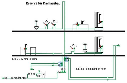 Um bei allen Betriebsbedingungen (Belegungssituationen) einen ständigen Wasseraustausch zu gewährleisten, werden jeweils am Ende der Versorgungsleitung noch so genannte Hygienespüleinrichtungen empfohlen. Die Spülungen können zeit-, volumenstrom- und temperaturgesteuert ausgelöst werden. Das während des Spülvorgangs austretende Wasser kann aufgefangen und als Grauwasser zur WC-Spülung oder zur Gartenbewässerung verwendet werden.