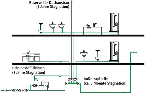 Selbst wenn Planung und Ausführung alle Regelwerke sorgfältig beachtet haben, das Schutzziel „Trinkwasserhygiene“ wird meistens nicht ohne zusätzliche Maßnahmen erreicht: Von der bei der Auslegung unterstellten Normnutzung wird später mehr oder weniger deutlich abgewichen. Stagnation mit all ihren negativen Folgen ist deswegen heute in gering ausgelasteten Hotels, in größeren Wohngebäuden, Pflegeheimen sowie Schulen und anderen Einrichtungen mit längeren Betriebsunterbrechungen an der Tagesordnung. Es sei denn, der Betreiber engagiert sich aufgrund einer erkannten Abweichung zwischen Auslegung und Nutzung freiwillig oder nach festgestellten Problemen gezwungenermaßen. Aber auch in nahezu jedem Einfamilienhaus wird man Teilbereiche mit Stagnation lokalisieren können: Die oft wochenlang nicht benutzte Gartenzapfstelle, ein „Füllanschluss“ für die Heizungsanlage mit langer Zuleitung, selten benutzte Gästetoiletten, Reserveanschlüsse für noch nicht verwirklichte oder längst aufgegebene Ausbauträume.
