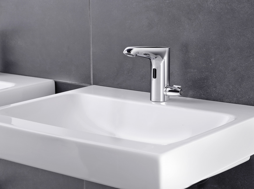 Ein weiterer Grund liegt in der Technik von Armaturen. Die UBA-Empfehlung fordert: „Die Beprobung von Mischwasser ist zu vermeiden.“ Anschließend benennt sie „Einhebel-Mischbatterien“, bei denen „dies nicht immer zu gewährleisten“ ist. Dieser Armaturentyp ist sicherlich exemplarisch gemeint, denn die Aussage gilt gerade auch für Armaturen mit Mischwellen und für Entnahmestellen hinter Thermostaten. Bei Letzteren wird bestimmungsgemäß immer Kaltwasser zugemischt, um die Temperatur auf die in DIN EN 806-2 Kapitel 9.3.2 geforderten Temperaturen für „Krankenhäuser, Schulen, Seniorenheime“ aber auch „Kindergärten und Pflegeheime“ zu begrenzen (Bild 3).