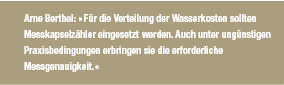 Zusätzlich sind große Verbrauchsunterschiede einzelner Wohnungen ein wichtiges Thema. Während Energiekostenabrechner für vergleichbare Wohnungen bei den Heizkosten eine Verdichtung der Streuungen im Bereich 1 : 2 angeben, liegen sie bei der Wasserabrechnung bei 1 : 11. Dennoch sind zwischen Mietern und Vermietern bei Auseinandersetzungen um Nebenkosten fast immer die Heizkosten das Thema. Die Zahlen zeigen aber, dass die Abrechnung des Wasserverbrauchs mindestens die gleiche Aufmerksamkeit verdient. Offensichtlich genießen die Messwerte von Wasserzählern ein hohes Vertrauen, so dass kaum jemand die Messwerte anzweifelt.