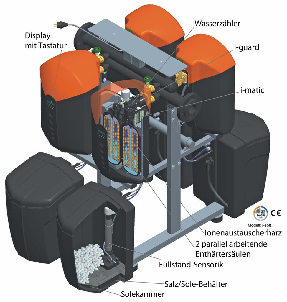 - Hygienische Vorteile ergeben sich zudem aus der werkseitigen Harzbefüllung und einer Paralleldurchströmung aller nicht in der Regeneration befindlichen Enthärtersäulen.
