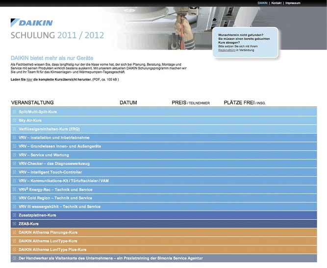 Schulungen von Daikin können jetzt direkt über https://www.daikin-schulung.de/ gebucht werden. Die Website gibt Montage- und Servicetechnikern, Planern sowie Projektanten einen Überblick über das umfangreiche Schulungsprogramm und ermöglicht eine einfache und schnelle Anmeldung. Insgesamt 18 Themenkurse werden in den sechs regionalen Schulungscentern Berlin, Hamburg, Frankfurt, Düsseldorf, Stuttgart und München von erfahrenen Praktikern gehalten. Das Schulungsprogramm gibt einen detaillierten technischen Einblick in das Produktportfolio von Daikin. Aber auch Planung, Service, Wartung und Kundenkommunikation stehen im Mittelpunkt. Die Kurse werden in lernintensiven Kleingruppen von maximal 16 Teilnehmern angeboten. Bei einigen Themen ist auch eine individuelle Absprache für den Termin und die Gruppengröße möglich. https://www.daikin-schulung.de/