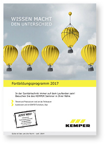 Unter dem Titel „Wissen macht den Unterschied“ hat Kemper sein Fortbildungsprogramm 2017 rund um die Sanitärtechnik in einer Broschüre zusammengestellt. Namhafte Fachreferenten schulen aktuelle Themen, die die Branche bewegen. Die Seminare werden bundesweit und am Standort Olpe angeboten. Neu im Programm ist u. a. das Fachseminar „Trinkwassererwärmung zentral / dezentral“. Auf Basis von normativen Vorgaben und Berechnungsbeispielen werden hier Lösungen aufgezeigt, die zur deutlichen Verschlankung ganzer Erwärmungssysteme führen können – inklusive der Senkung der Investitionskosten. Das Fortbildungsprogramm kann unter datenservice@kemper-olpe.de angefordert werden. Eine PDF-Version steht zum Download auf: www.kemper-olpe.de