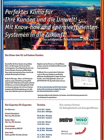 Im Herbst 2011 setzen Zehnder, Oventrop und Wilo ihre Seminarroadshow unter dem Motto „In vier Schritten – Klima rauf und Kosten runter“ fort. Die Expertenseminar-Reihe richtet sich an Fachplaner und Architekten. Die Veranstaltung gastiert am 5. Oktober in München, am 6. Oktober in Pforzheim, am 23. November in Hamburg und am 24. November in Berlin. Die Schulung zeigt die großen Energiesparpotenziale durch eine optimale Systemkompetenz bei Strahlungsheizung und -kühlung, komfortabler Raumlüftung, hydraulischem Heizkörperabgleich sowie dem Einsatz von Hocheffizienzpumpen. Als besonderes Special wird an jedem Schulungs-Termin (12.00 bis 18.30 Uhr) unter den Teilnehmern ein Apple iPad verlost. Anmeldung und Detailinformationen stehen auf: