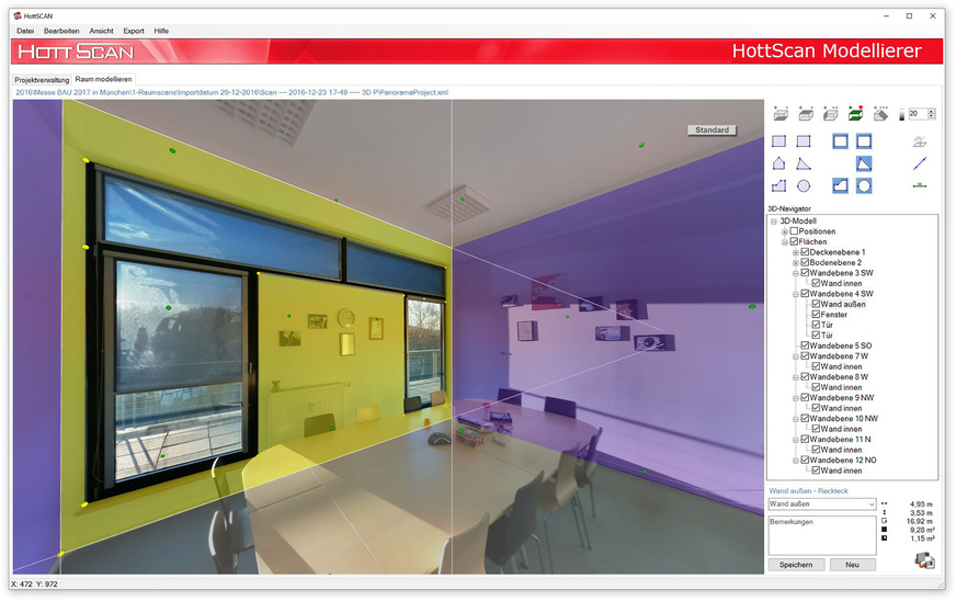 Aus den parallel erstellten Einzelbildern wird ein räumliches 3D-Panoramabild erstellt. Nach der Übergabe der Mess- und Fotodaten kann der Anwender mit der dazugehörigen Fotoaufmaß-Software am PC beispielsweise Räume dreidimensional modellieren. Dabei werden mithilfe der Messpunkte Raumebenen definiert, innerhalb derer CAD-Objekte millimetergenau eingegeben werden können. So entstehen schrittweise CAD-Aufmaßskizzen, die zusammen mit Mengenauswertungen per Schnittstelle an CAD-, respektive Angebots- oder Abrechnungsprogramme übergeben werden können.