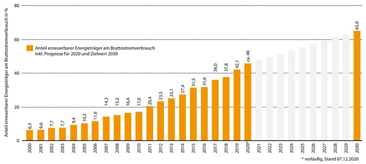 Der Anteil erneuerbarer Energien am Bruttostromverbrauch wird 2020 bei etwa 46 % und damit gut vier Prozentpunkte über dem Wert für 2019 (42 %) liegen. Das ergab eine vorläufige Auswertung der Geschäftsstelle der Arbeitsgruppe Erneuerbare Energien-Statistik (AGEE-Stat) am Umweltbundesamt (UBA).