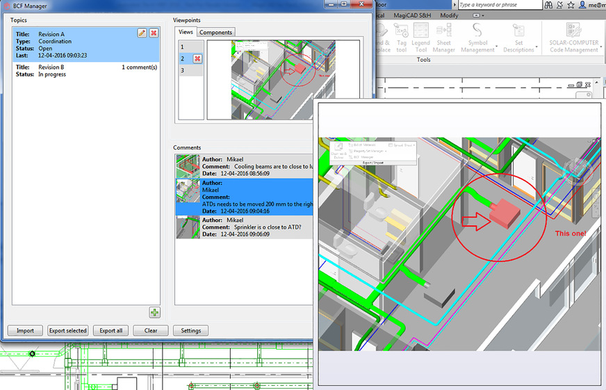 Eine Besonderheit des BCF-Formats ist seine intelligente Kommunikation mit den beteiligten Programmen: BCF erkennt, welche Bearbeiter, Programme, Bauteile oder Elemente an einem Problem beteiligt sind – das können auch mehrere Elemente sein, beispielsweise ein Lüftungskanal und ein Wanddurchbruch.