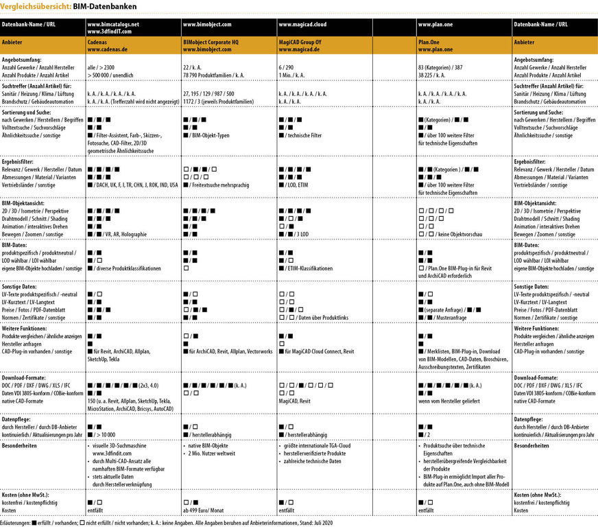 Immer mehr Bauprodukthersteller stellen smarte, parametrisierbare, konfigurierbare und mit Produktattributen versehene BIM-Objekte, entweder im BIM-Standardformat IFC oder in proprietären CAD-Datenformaten, zum Download bereit. Während die meisten Datenbanken ein breites, gewerkübergreifendes Produktangebot für alle Gewerke offerieren, haben sich andere auf bestimmte Inhalte spezialisiert, etwa Architekturobjekte, Möbel und (Bad-)Einrichtungen oder TGA-Bauteile.