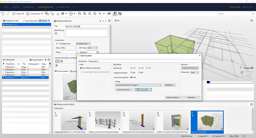 Darüber hinaus verfügen BIM-Modell-Checker auch über Auswertungs-, Koordinations- und Kooperationswerkzeuge. Werden sehr viele Konflikte entdeckt, so können sie entsprechend einer zuvor definierten Prioritätenliste automatisch nach ihrer Relevanz sortiert werden. Das vereinfacht die Prüfung insbesondere größerer, komplexerer Modelle.