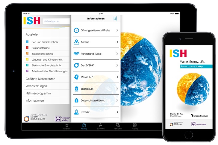 Der mobile Messekatalog zur ISH 2017 ist mit dem ebenfalls kostenfrei nutzbarem Online-Messekatalog www.ish2017.com kompatibel und bietet: