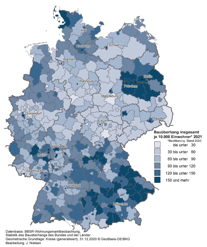 Eine Auswertung des Bundesinstituts für Bau-, Stadt- und Raumforschung (BBSR) für die kreisfreien Städte und Landkreise ergibt, dass die meisten von den Bauämtern genehmigten, aber noch nicht fertiggestellten Wohnungen Ende 2021 Berlin (65 800), München (36 600) und Hamburg (26 500) aufwiesen. Dahinter folgen die Städte Frankfurt am Main (15 800) und Leipzig (10 500) und die Region Hannover (9400).