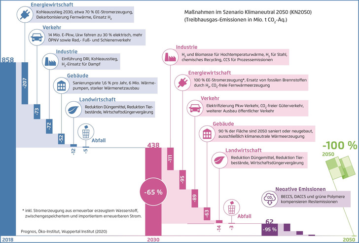 Klimaneutral bedeutet dabei, dass die Treibhausgasemissionen in allen Bereichen vollständig oder fast vollständig vermieden werden. In der Landwirtschaft und in einzelnen industriellen Prozessen verbleiben auch im Jahr 2050 noch Restemissionen. Diese residualen Emissionen werden durch die gezielte CO2-Entnahme aus der Atmosphäre und Speicherung als sogenannte „negative Emissionen“ ausgeglichen. In der Summe wird Deutschland so klimaneutral.