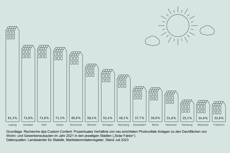 Das Ergebnis beim SolarCheck 2023: Der Photovoltaik-Ausbau kommt in den Metropolen deutlich schneller voran. In den meisten Städten herrschen also überwiegend sonnige Aussichten statt schattiger Wolken: Der SolarCheck erfasst das Verhältnis der Fläche neu errichteter Solaranlagen zu den neu gebauten Dachflächen. Der so ermittelte Solar-Faktor zeigt, wie ambitioniert der Solarausbau in den einzelnen Metropolen vorangetrieben wird. Im Durchschnitt liegt der Solar-Faktor bei 51,2 % – rund die Hälfte des PV-Potenzials neuer Dachflächen wird also genutzt.