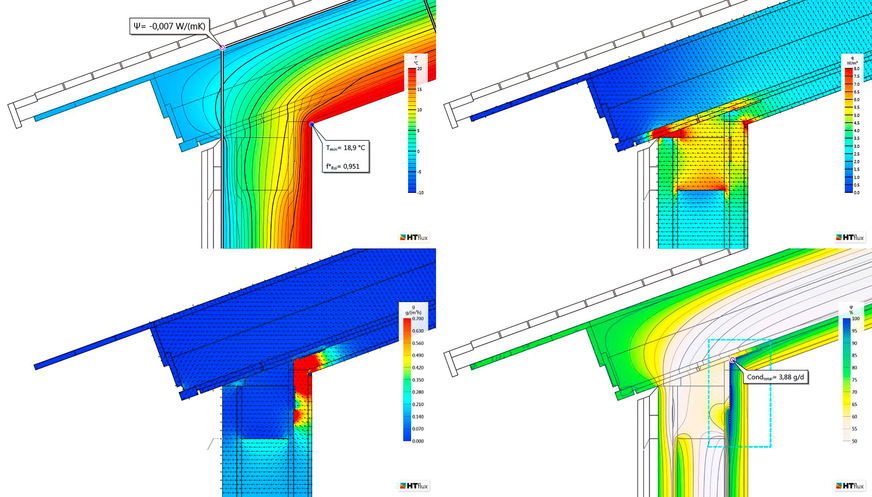 ■ Für komplexere Bauteile, Fenster, Fassaden und Anschlüsse sind spezielle Wärmebrücken-Simulationsprogramme sinnvoller, da sie auch den Wärme- und Feuchtetransport in Bauteilen und Bauteilanschlüssen in zwei- oder dreidimensionaler Richtung präzise und detailliert berechnen.