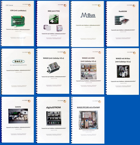 Das beste Verständnis zu den Technologien erhält man, wenn man sich mit jeweils einfachen exemplarischen Installationen befasst. Deshalb wurden im Rahmen von Projektarbeiten bzw. im Vorfeld eines „Praktikums Gebäudeautomation“ entsprechende Aufbauten samt Tutorial erstellt. Zum einen erhält man bereits durch das Durchlesen einen Eindruck über die Komplexität der Technologie bzw. den Anspruch und die Möglichkeiten von Programmierung/Inbetriebnahme. Zum anderen können die Tutorials bei Interesse auch als Vorlage bzw. Anregung für eigene Aufbauten verwendet werden. Im Detail wurden die folgenden Tutorials erstellt: