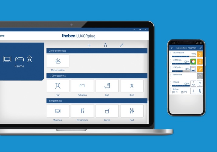 LUXORliving Smart Start ist optional auch via Internet über die Theben-Cloud steuer- und administrierbar. Dank BSI-zertifiziertem Rechenzentrum in Deutschland sind höchste Datensicherheit und zuverlässiger Schutz vor Manipulationen gewährleistet. Mit der LUXORplay App lassen sich sämtliche Funktionen des Smart Home-Systems steuern und Zustände überwachen. Für Servicefälle können Kunden die Administration des Gateways an Partner übergeben, z. B. einen Installateur oder den Theben-Service.