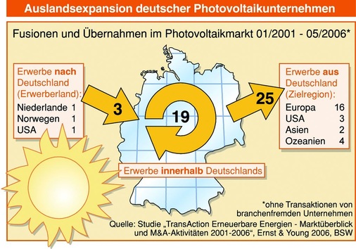 Photovoltaikunternehmen aus Deutschland sind bei internationalen Firmenübernahmen spitze. Sogar an der Spitze. Zu diesem Ergebnis kommt die Studie TransAction Erneuerbare Energien - Marktüberblick und M & A- Aktivitäten 2001 - 2006 der international renommierten Prüfungs- und Beratungsgesellschaft Ernst & Young. Die Studie, die Ende November auf dem 7. Forum Solarpraxis vorgestellt wurde, analysiert auch 72 Übernahmen von Photovoltaikunternehmen. Davon wurden 50 Transaktionen von deutschen Unternehmen initiiert. Lässt man innerdeutsche Transaktionen unberücksichtigt, so kauften mehr als achtmal so viele deutsche Photovoltaikunternehmen im Ausland zu wie ausländische Unternehmen in Deutschland. Zielregionen waren Europa, die USA, China und Australien.