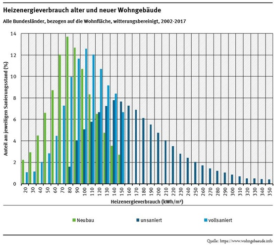 Als Kennwert für die Energieeffizienz von Wohngebäuden dient der Heizenergieverbrauch für Raumwärme und Warmwasser, bezogen auf die Wohnfläche und bereinigt von Witterungseinflüssen. Die Besonderheit der Daten: Sie verknüpfen gemessene Heizenergieverbräuche mit detaillierten Informationen über die Eigenschaften der Gebäude. Damit lassen sich Energieverbrauch und Modernisierungsstand von Wohngebäuden in Deutschland von 2002 bis heute beschreiben und auswerten. ■
