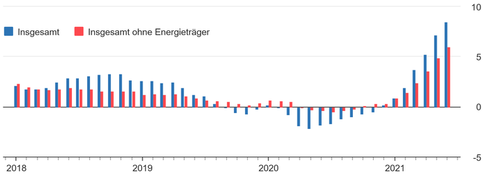 Die Erzeugerpreise gewerblicher Produkte sind im Juni 2021 um 8,5 % gegenüber Juni 2020 gestiegen. Das war der höchste Anstieg seit 1982 (2. Ölkrise).