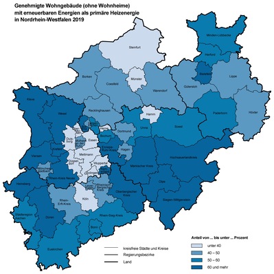 In Nordrhein-Westfalen soll rund jedes zweite (50,6 %) der 18 334 im Jahr 2019 genehmigten Wohnhäuser (ohne Wohnheime) überwiegend oder ausschließlich mit erneuerbaren Energien beheizt werden. In einigen Kreisen liegt die Quote bereits über 80 %.