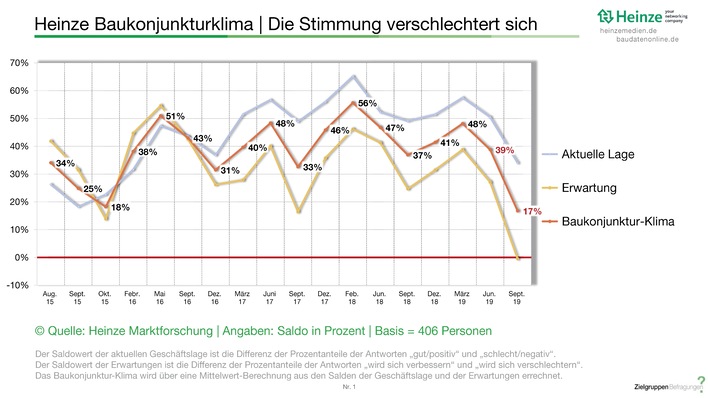 Die Stimmung in der Bauindustrie verschlechtert sich im 2. Halbjahr 2019 beträchtlich. Der Heinze Baukonjunktur-Klima-Index sinkt von 48 % im März 2019 auf 39 % im Juni und kommt mit 17 % im September auf einem Tiefpunkt an. Es sind vor allem die zukünftigen Erwartungen, welche die Stimmungslage der Industrie drücken.