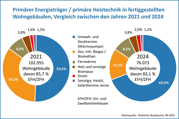 Bei den 2024 fertiggestellten Wohngebäuden dominieren Wärmepumpen als primäres Heizsystem mit einem Anteil von 69,4 % – ein Zuwachs um 4,9 Prozentpunkte.
