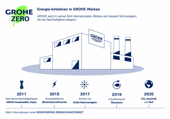 Mit dem Ziel, bis 2020 als erster führender Hersteller der Sanitärbranche eine CO2-neutrale Produktion zu erreichen, hat Grohe im Rahmen der Nachhaltigkeitsinitiative „Grohe goes Zero“ bereits alle fünf Produktionsstandorte weltweit sowie die Logistikzentren in Deutschland auf Ökostrom umgestellt. Ab April 2020 wird der Sanitärhersteller unvermeidbare CO2-Emissionen durch zwei Kompensationsprojekte ausgleichen.