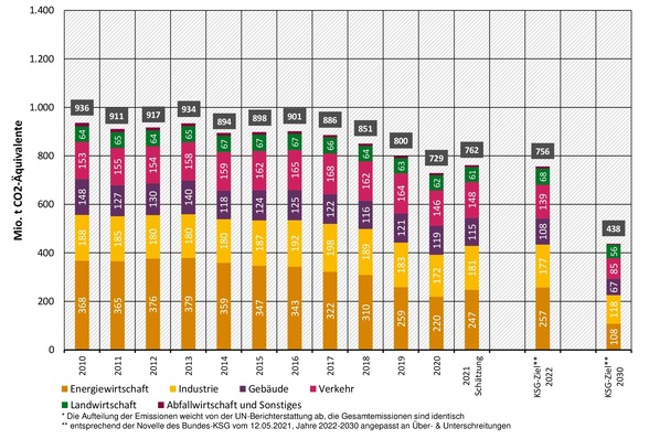 Die bisher vorgesehenen Maßnahmen des Klimaschutzprogramms 2030 reichen nach vorliegenden Abschätzungen nicht für das Erreichen des Klimaziels bis zum Jahr 2030 aus. Insgesamt entsteht gegenüber dem Ziel des Bundes-Klimaschutzgesetzes eine Lücke von rund 70 Mio. t/a CO2-Äquivalent, davon 17 Mio. t/a CO2e im Gebäudebereich.