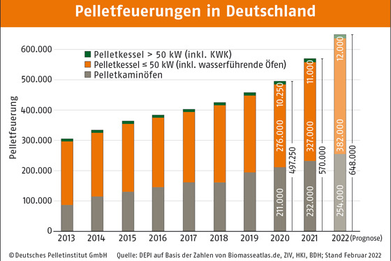 Für 2019 meldet der Deutsche Energieholz- und Pellet-Verband (DEPV) ein Zubau von 34.650 Holzpellet-Feuerungen, was einem Wachstum von 4,3 % gegenüber dem Vorjahr entspricht. Ende 2019 waren in Deutschland 492.000 Holzpellet-Feuerungen in Betrieb.