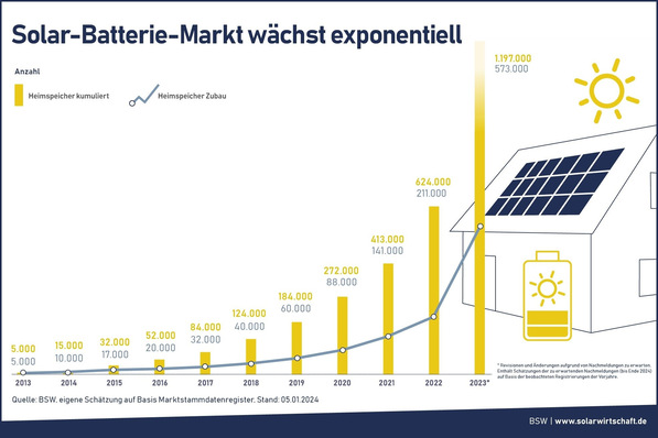 Die Nachfrage nach Solarstromspeichern ist im Jahr 2023 um über 150 % gestiegen. Inzwischen sind über 1 Mio. stationäre Stromspeicher in Betrieb.