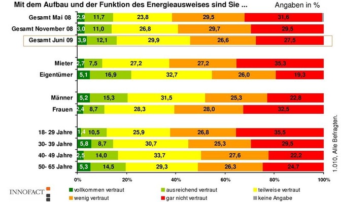 Fast alle der 3000 im GDW organisierten Wohnungs- und Immobilienunternehmen haben heute bereits Energieausweise für ihren gesamten Wohnungsbestand erstellen lassen. Sehen will ihn indes kaum jemand: Rund 82 % der Unternehmen erklärten, dass die Energieausweise bei einer Neuvermietung oder einem Verkauf von den Interessenten praktisch nie verlangt werden.