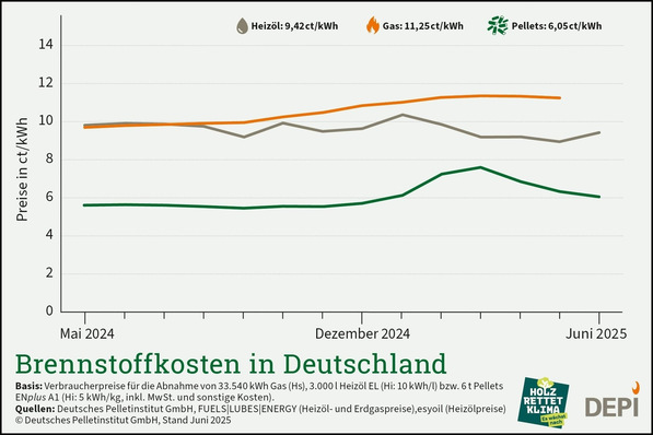 Der Preis für Holzpellets ist im Juni 2025 gegenüber dem Vormonat um 4,3 % auf 302,45 Euro/t gesunken und liegt damit aktuell 1,6 % unter dem 12-Monatsdurchschnitt von 307,36 Euro/t.