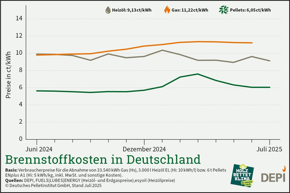 Der Preis für Holzpellets ist im Juli 2025 gegenüber dem Vormonat um 0,1 % auf 302,69 Euro/t gestiegen und liegt damit aktuell 2,1 % unter dem 12-Monatsdurchschnitt von 309,12 Euro/t.