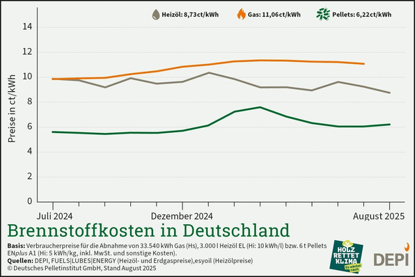Der Preis für Holzpellets ist im August 2025 gegenüber dem Vormonat um 2,7 % auf 310,82 Euro/t gestiegen und liegt damit aktuell nur 0,3 % unter dem 12-Monatsdurchschnitt von 311,91 Euro/t.