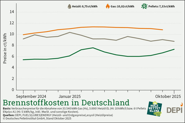 Der Preis für Holzpellets ist im Oktober 2025 gegenüber dem Vormonat um 9,3 % auf 366,25 Euro/t gestiegen und liegt damit aktuell 12,9 % über dem 12-Monatsdurchschnitt von 324,27 Euro/t.