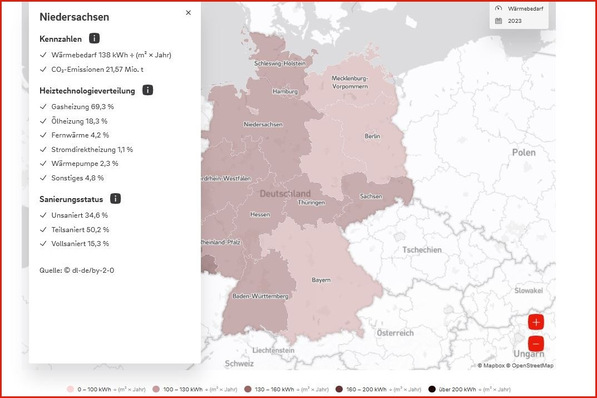 Eine digitale Wärmekarte liefert frei zugänglich Informationen zu Wärmeversorgung, Technologien, CO2-Emissionen und Sanierungsstand für jede Kommune.