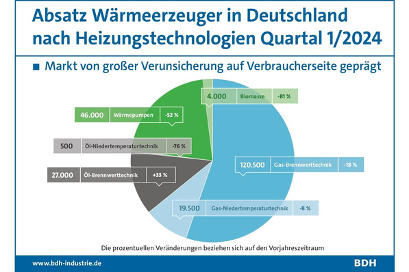 Die Heizungshersteller melden eine deutliche Eintrübung für Wärmeerzeuger. Der Absatz ist im 1. Quartal 2024 gegenüber dem Vorjahreszeitraum um 29 % gesunken.