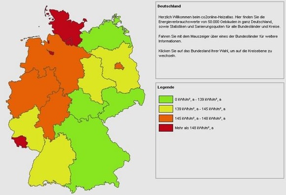 Der Heizatlas von co2online informiert Bundesländer, Kreise und Kommunen über den Heizenergieverbrauch und die Sanierungsquote von Wohngebäuden. Kommunen haben jetzt erstmals die Möglichkeit, den wärmetechnischen Zustand von Gebäuden in ihrer Region mit anderen zu vergleichen und sich einzelne Häuser standortgenau via Google-Maps anzusehen.